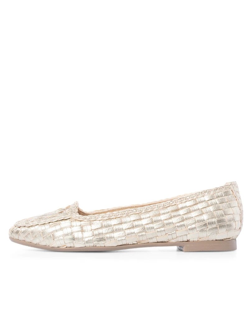 A flat woven ballet constructed entirely eco-friendly and designed by Ali MacGraw for Butter Shoes.