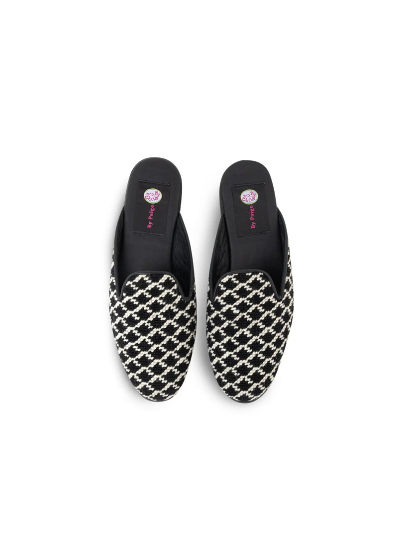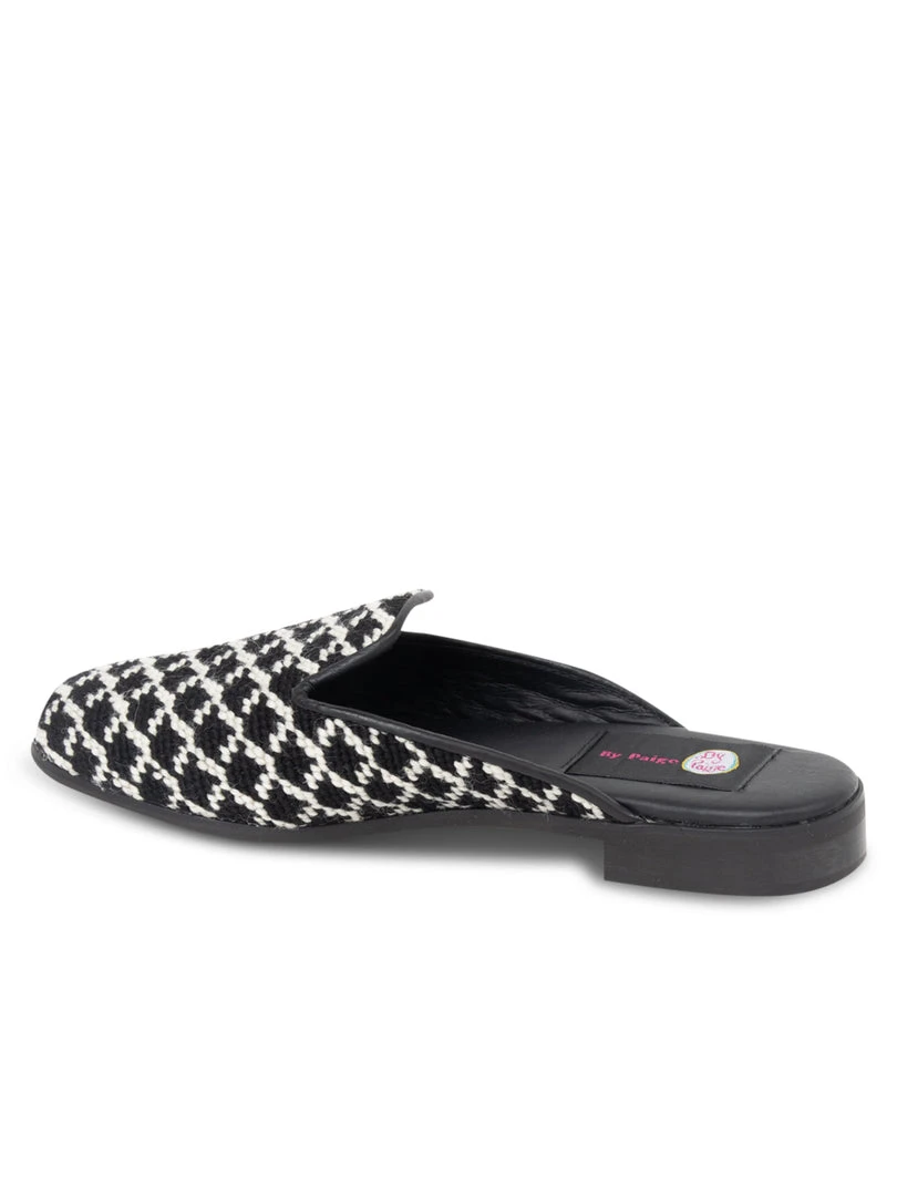 A handstitched needlepoint mule with whimsical designs to fit your every mood. Leather trim and lining.