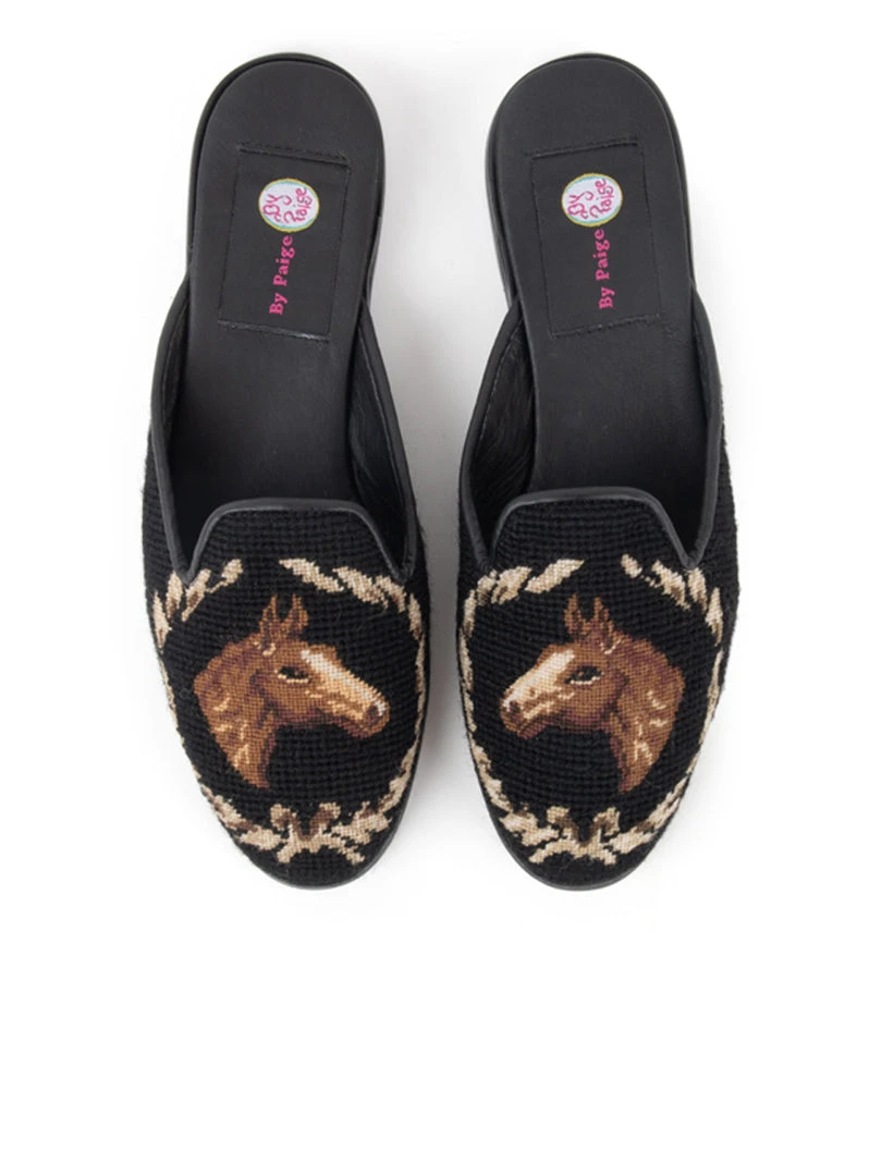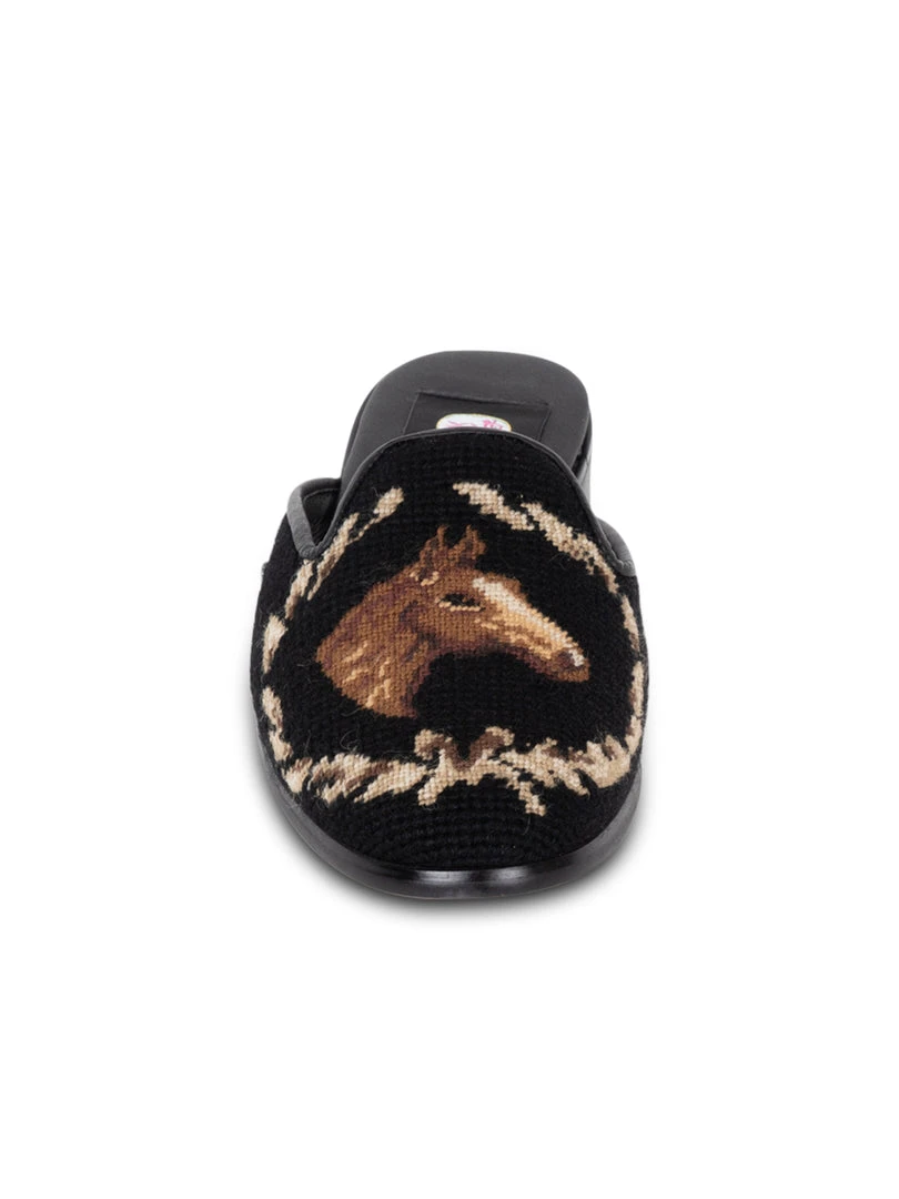 A handstitched needlepoint mule with whimsical designs to fit your every mood. Leather trim and lining.