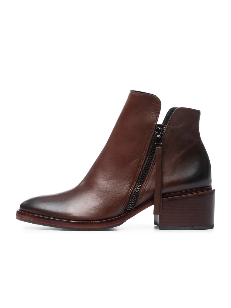 Sophisticated and versatile leather booties adorned with an outward facing zipper. The chunky heel makes these casual and comfortable enough for everyday wear.