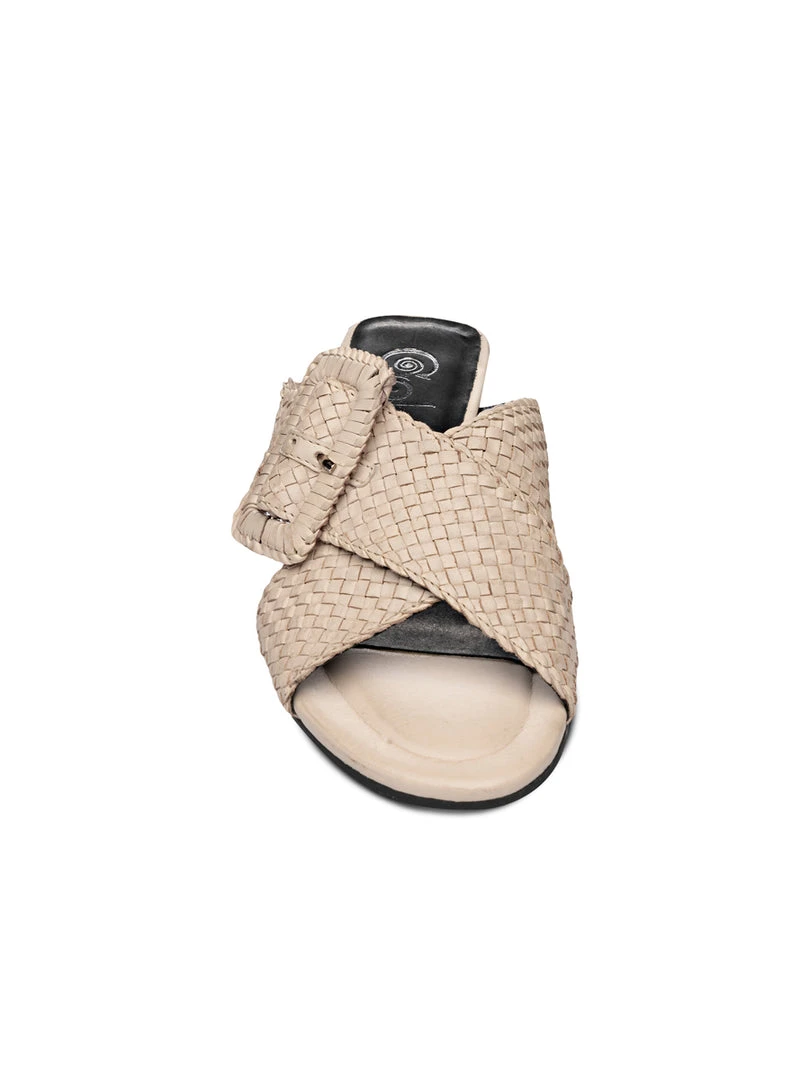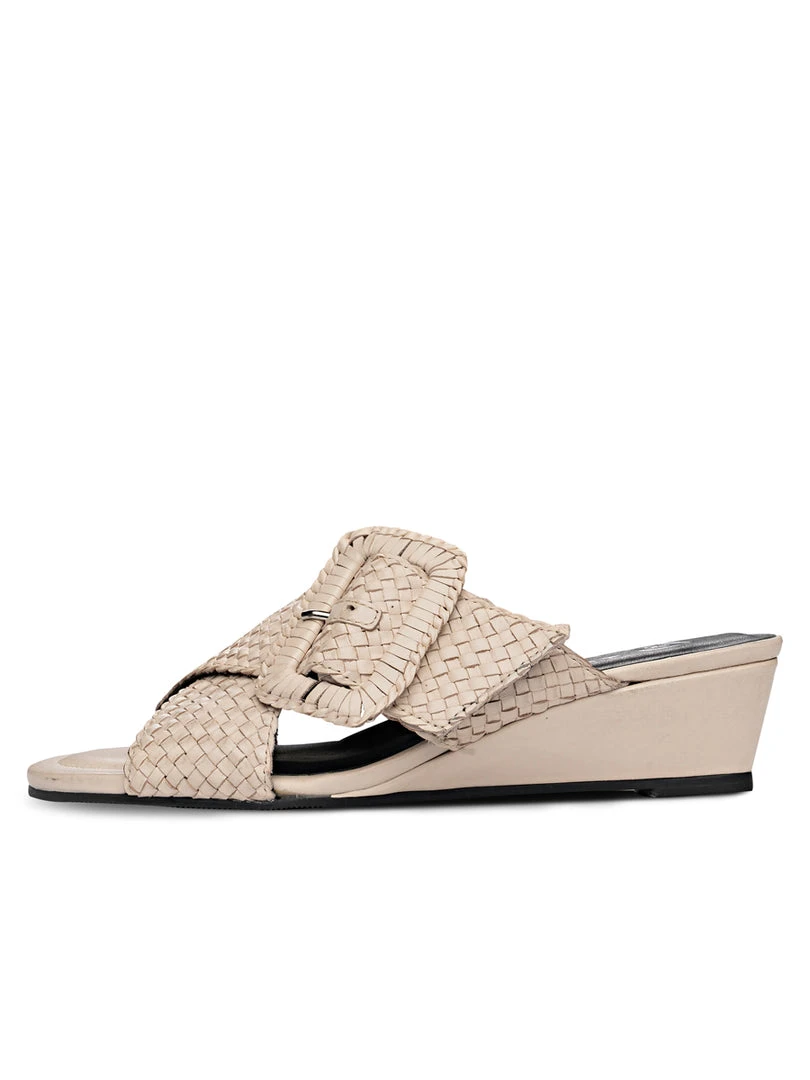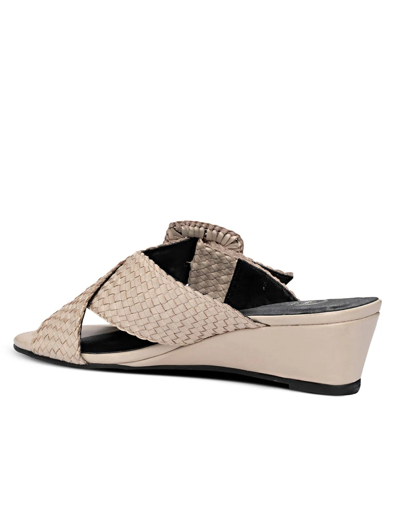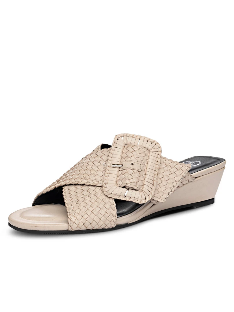 Wedge slide sandals adorned with a buckle are classically vintage. The wedge adds support and style to these beautifully woven leather slides.