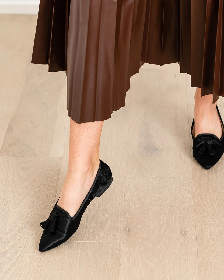 A sculpted pointed toe silhouette in luxe hair calf for a rich addition to your fall and winter shoe collection. Finished with a tassel detail and rubber sole, these shoes will carry you in style and comfort from day to night.