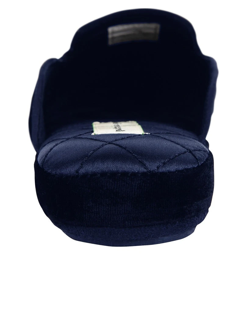 You will truly feel regal in our elegant velvet smoking slipper is embellished with a gold metallic crest. Quilted satin lining is padded for comfort. A slight wedge of 3/4 inch guarantees your comfort.