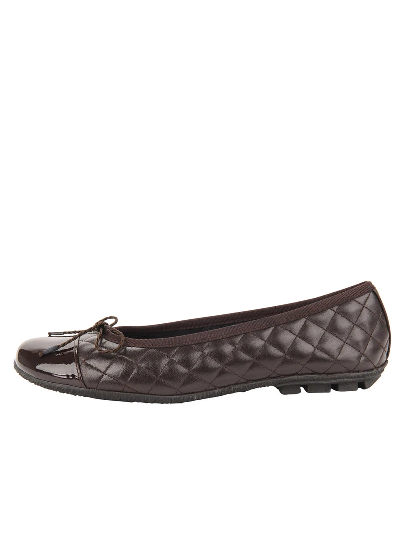 Our iconic quilted leather ballet flat with a patent leather cap toe. Fully functional fit-adjusting cord, fully padded leather sock lining. Lightweight, flexible rubber outer sole.