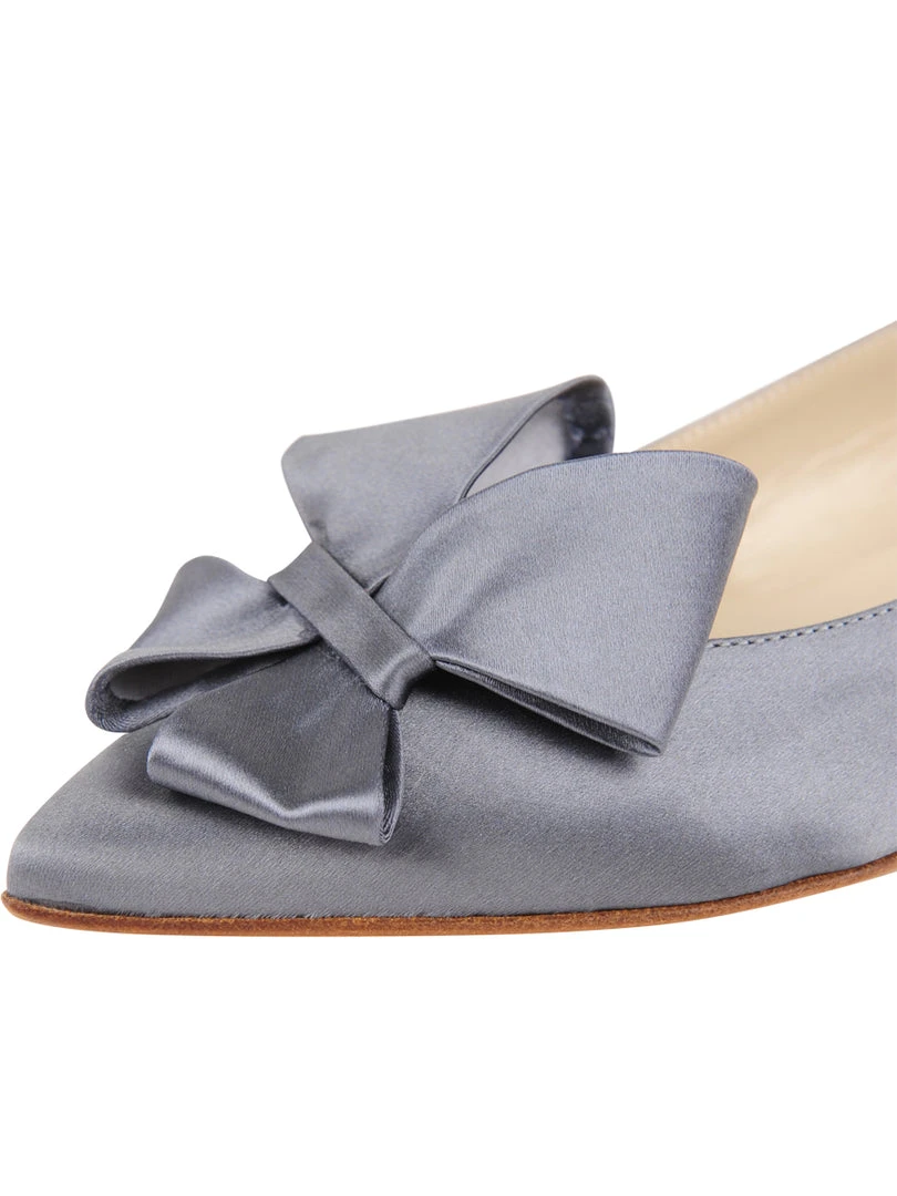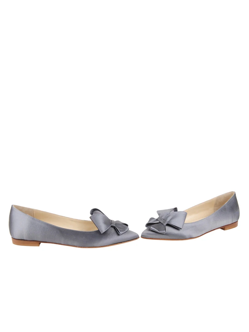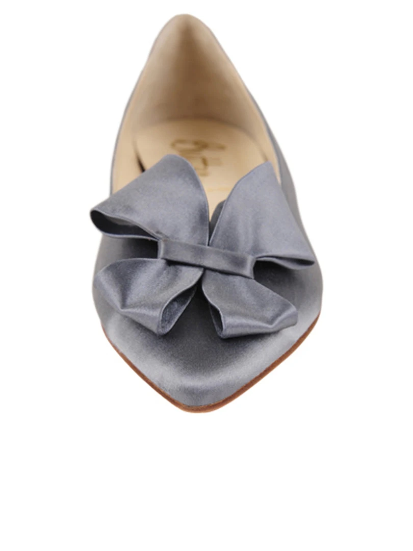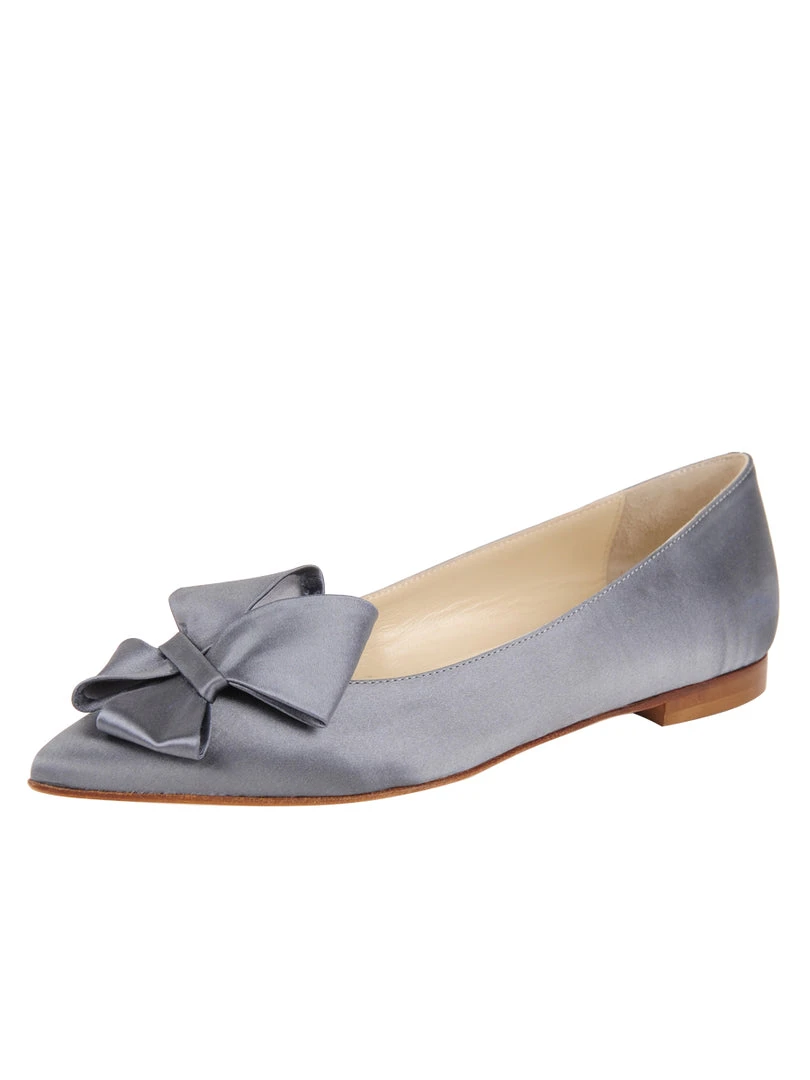 Stunning satin or suede covers these pointed toe flats. A satin Butter Bow makes these versatile and timeless.