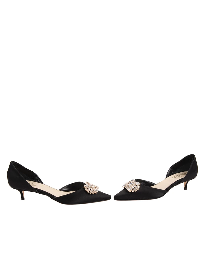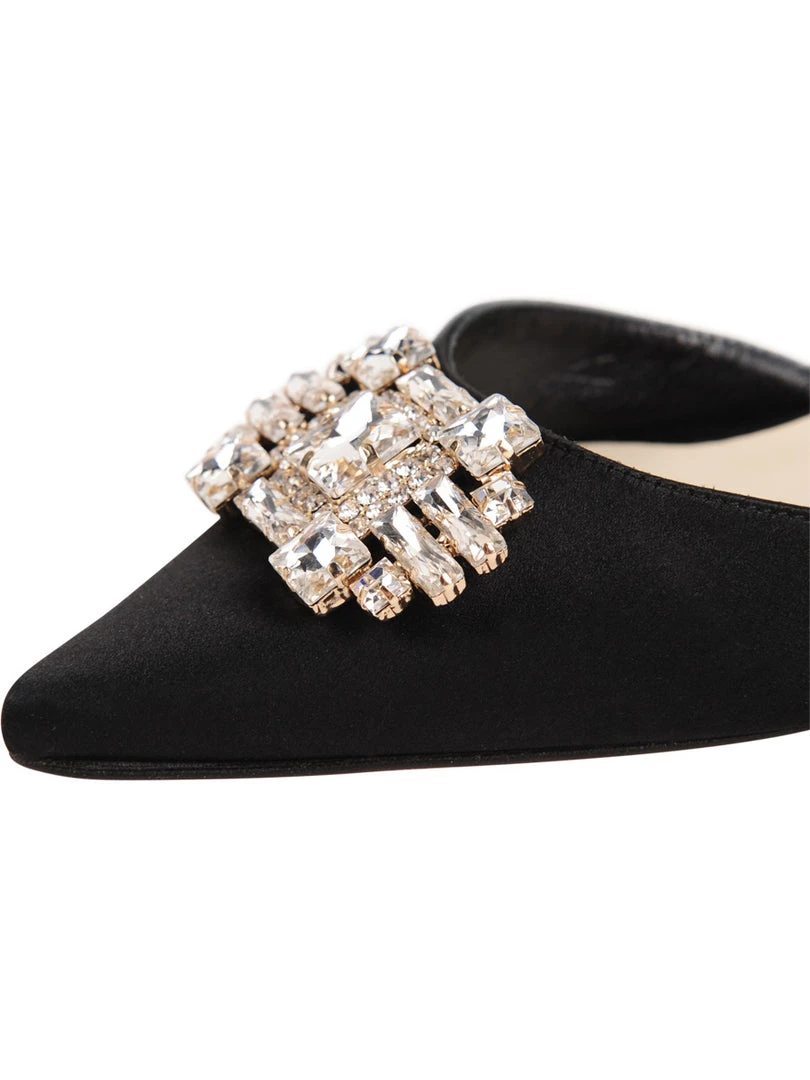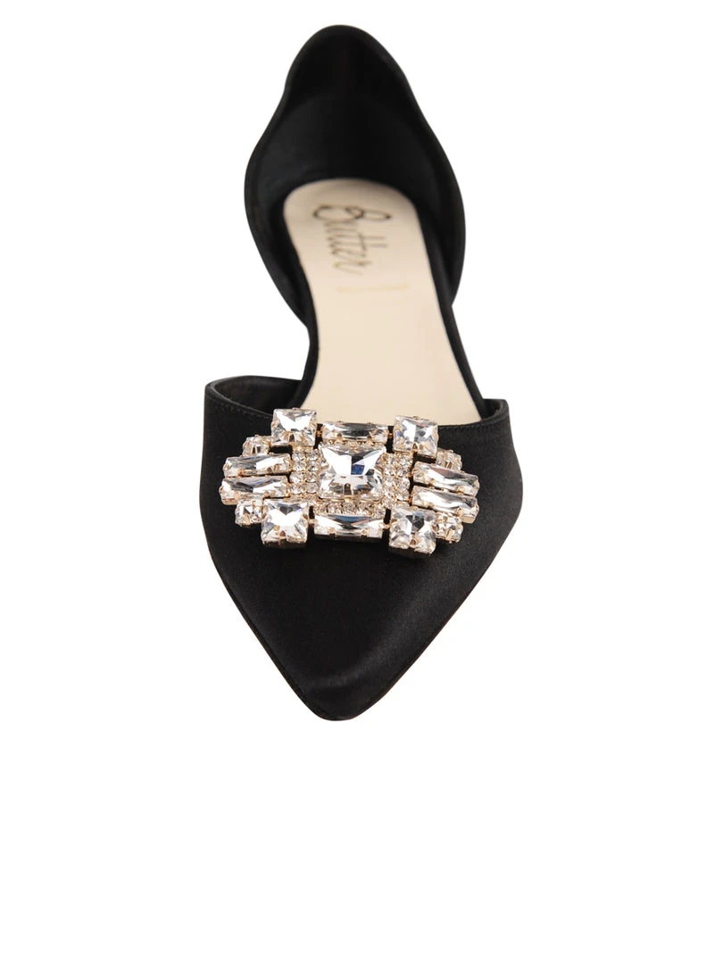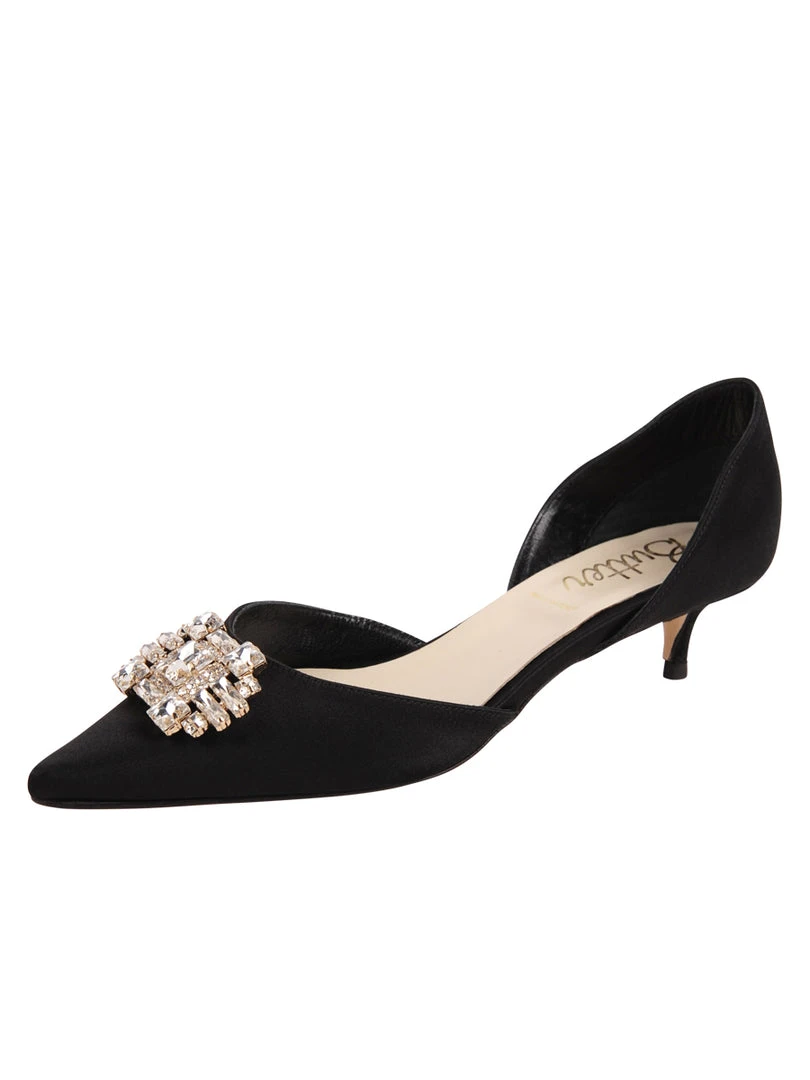 A stunning evening shoe to dazzle the night away in. Classic black satin with rhinestone art deco design at the toe.