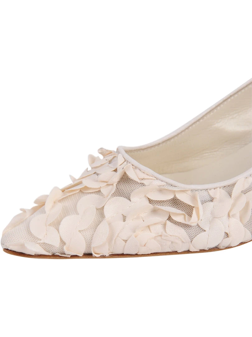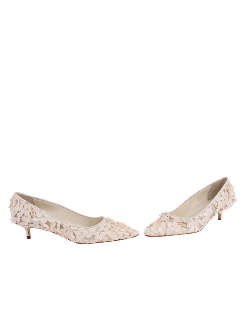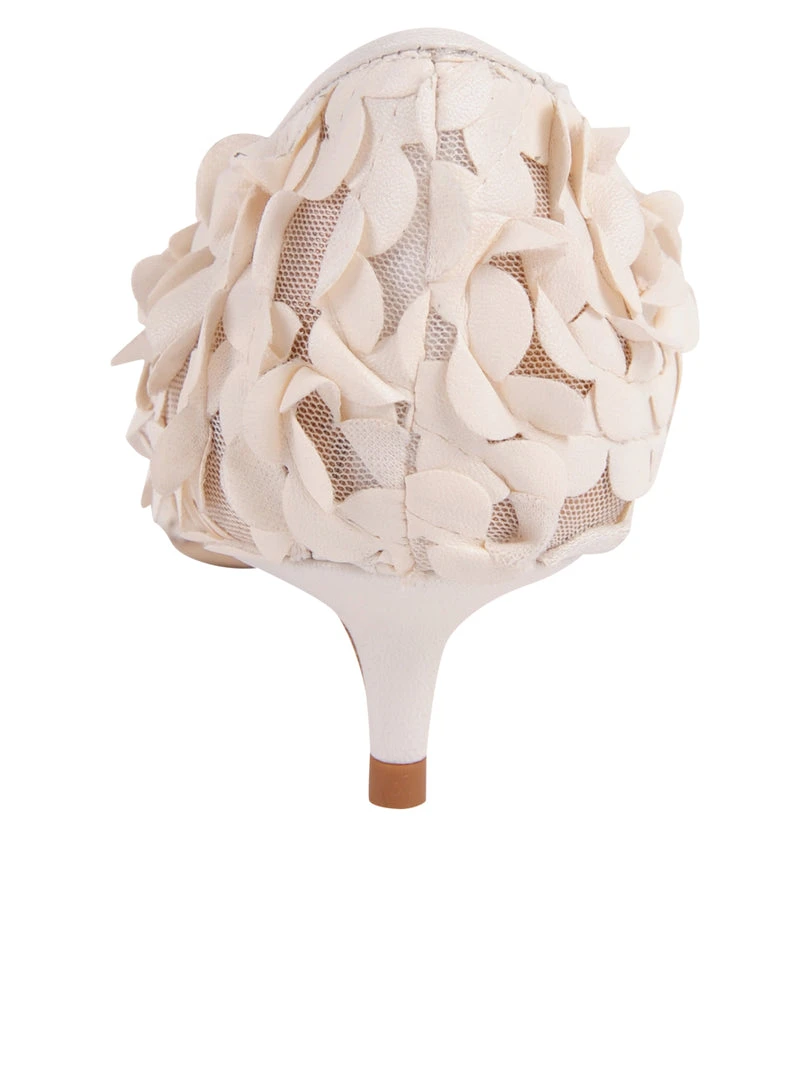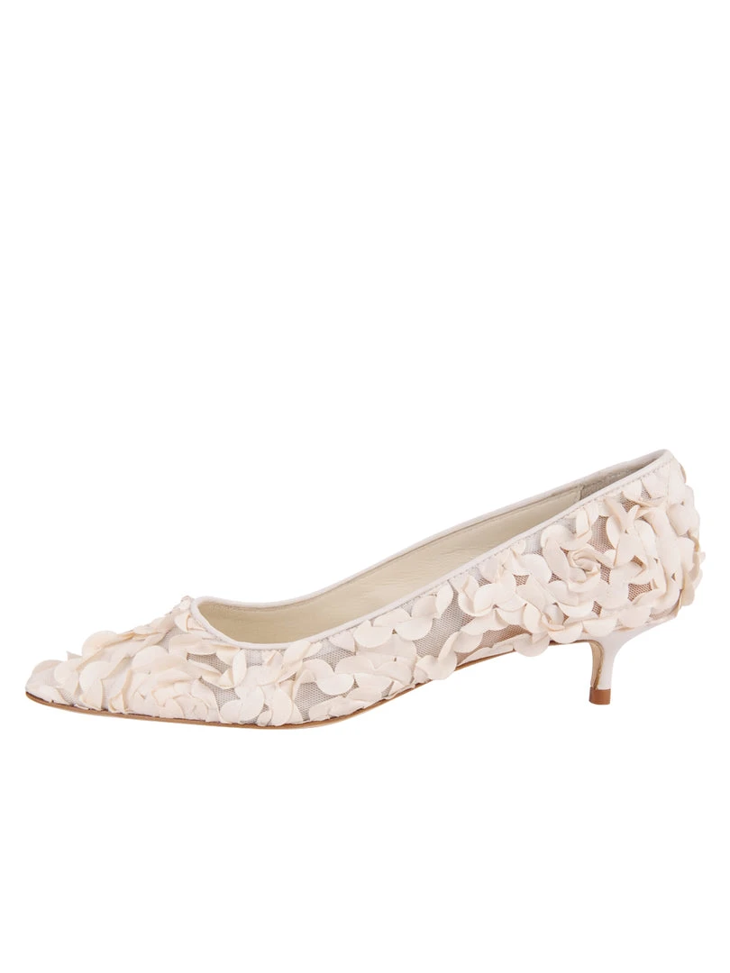 Steal the attention of the room in this fabulous kitten heel. Ecru fabric shaped into the form of rose petals creates an enchanting, must-have look.