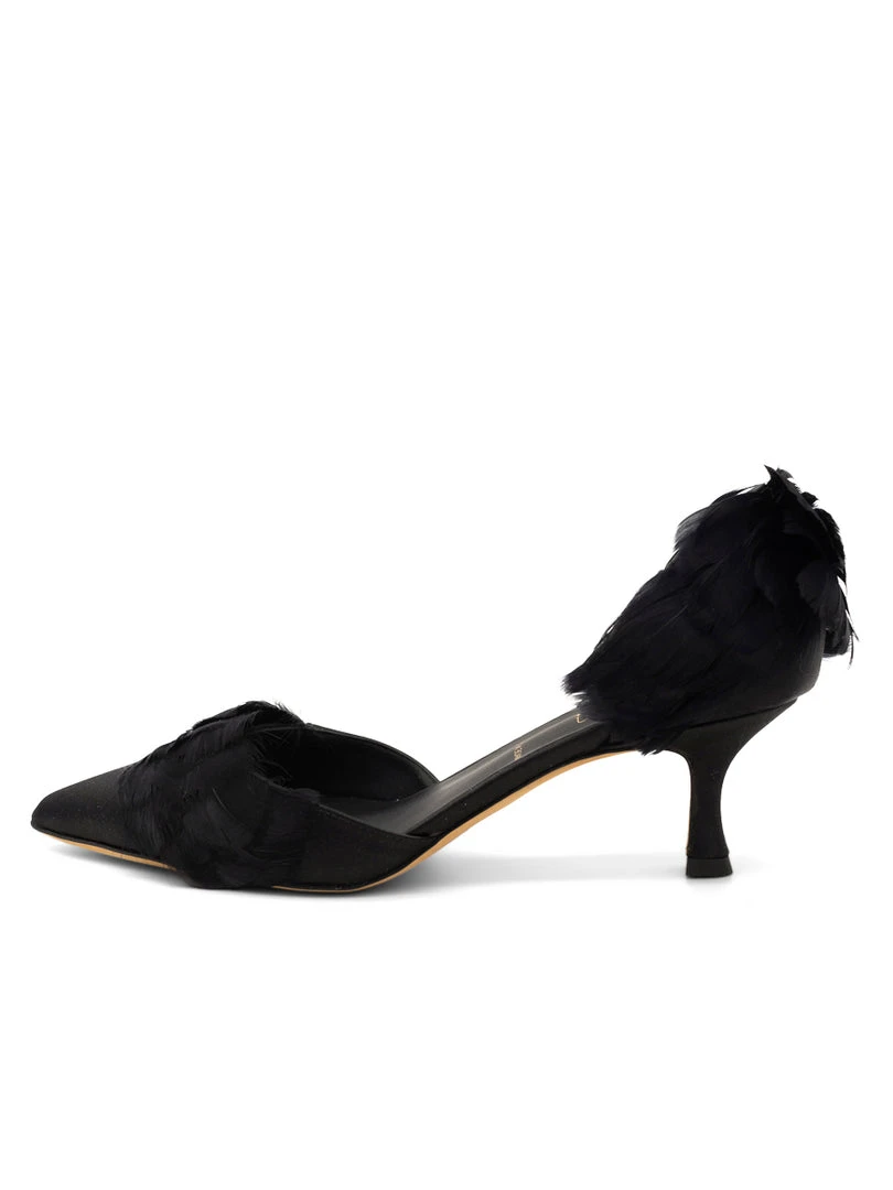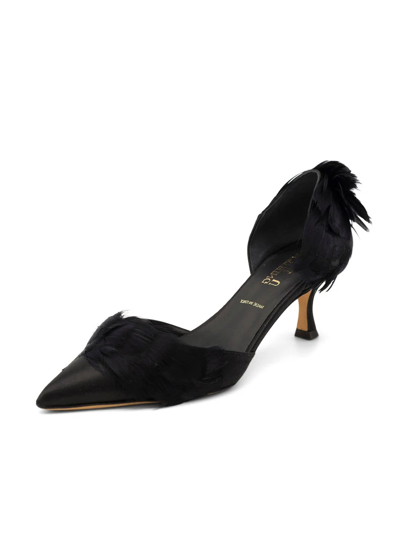 Gorgeous feathers adorn this d’orsay pointed toe pump for added elegance. These posh pumps are perfect to elevate your look for special occasions. Handcrafted in Italy by the finest Italian shoemakers. The leathers and materials used to make this shoe are all hand curated by Italian artisans for impeccable fit and quality.